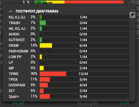Выпал неприятный борд, который оппоненту вероятно хорошо подошел, и он лепит пот-донк. По статам - на флопе у него "узкое место", на котором он играет максимально пассивно, а значит, по карте. % донка на флопе 10%, но сложно сказать что туда входит.
