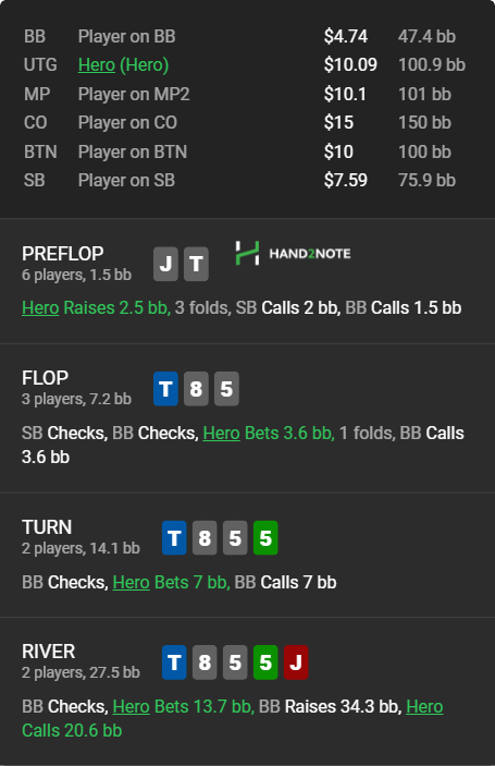 Ривер как сыгранно. Ставил бы 33% что бы Tx точно заплатили. И наверное после 33% ривер пришлось бы колить некрупный рейз т.к J8 против такой ставки точно порейзит, возможно спровоцируешь какие-то блефы. В твоем случае думаю на рейз нужно фолдить.
