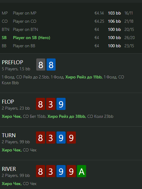 Чек/рейз хороший, хотя на такой сайзинг можно и колл сыграть, т.к. рендж полярный и я ожидаю частое продолжение по тёрну, против мелкой ставки наоборт хотим рейзить всегда