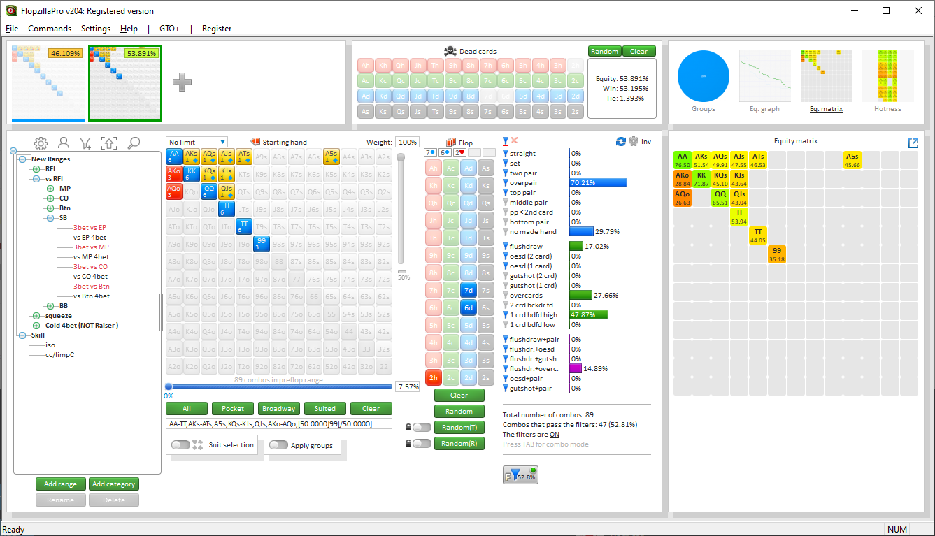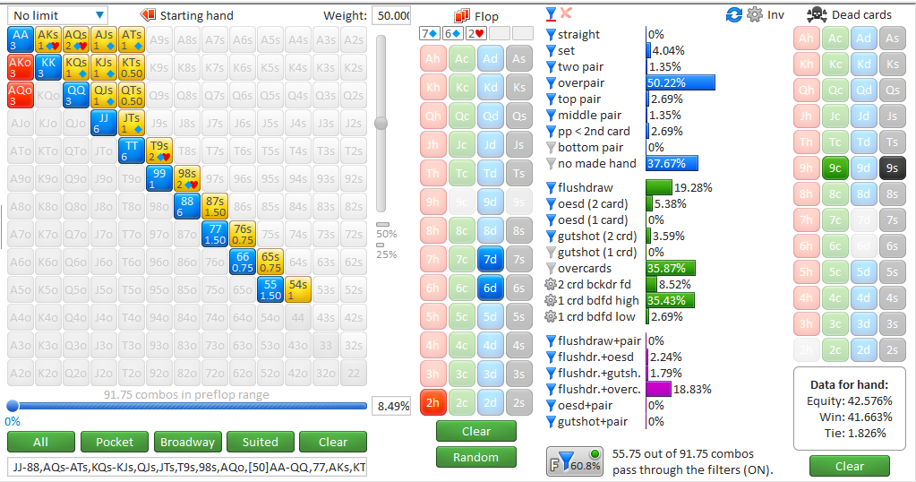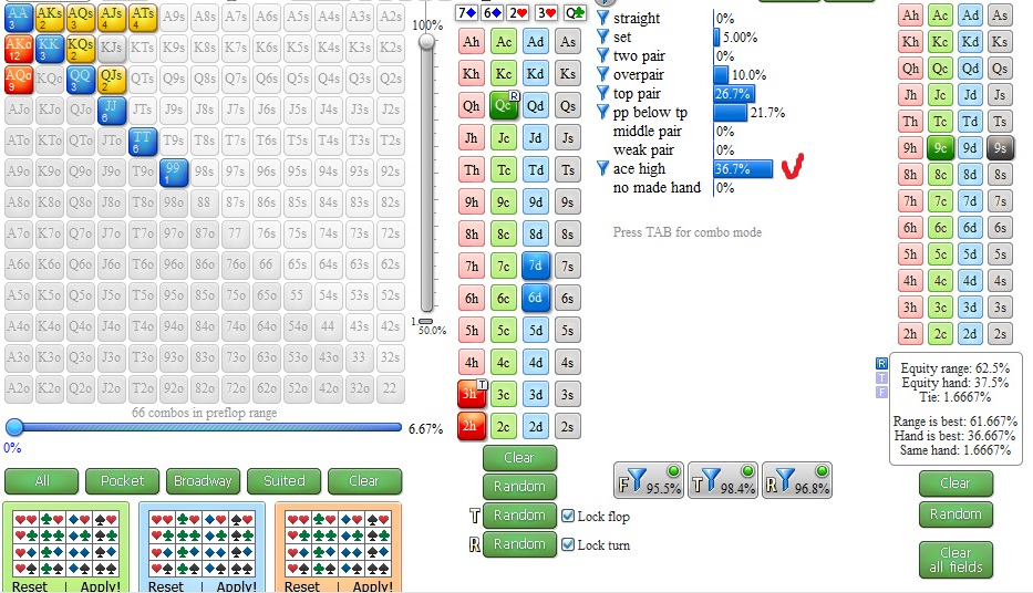 Наша рука здесь может быть лишь блефом (см. скрин против вышеописанного диапазона), но в то же время имеет какое-никакое ШДВ, а в нашем диапазоне будет вагон достойных блефов.