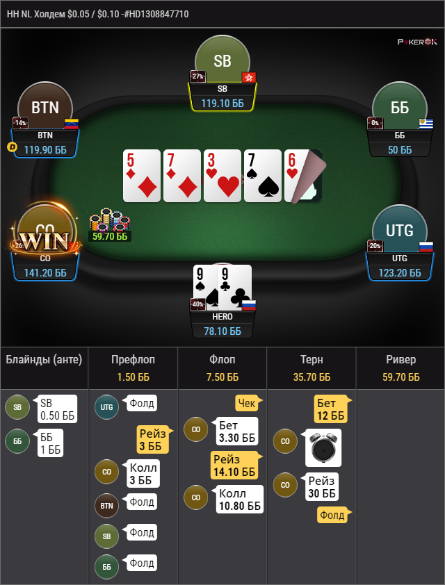 Флоп: на низкой доске решил сыграть x/r, думаю ошибки в этом нет. После колла стало понятно, что там что-то сильное.