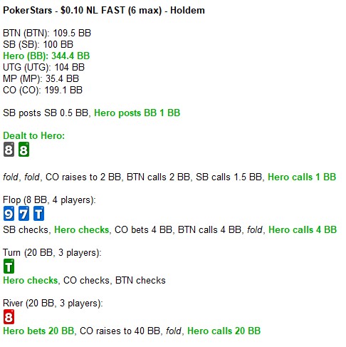 Сразу вопрос по фреплопу: 88 на bb это сквиз в троих или колл? На ривере доехал фулл и на свой бет я получил рейз. Я подумал что в диапазоне co есть и Т9 и Т7 и Т8, также есть J8 синие - поэтому просто заколлировал. Или все-таки нужно было рейзить? Оппонент неизвестный - 5 раздач.