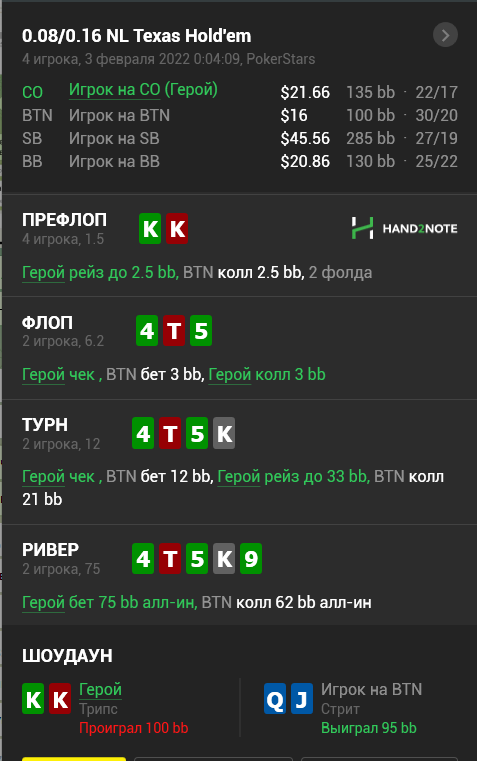 ФЛОП: Уход в пассивный розыгрыш, наверное худший вариант розыгрыша! У нас овер-пара, мы блочим флеш, у нас инициатива! Да без позиции, но для чего чек? Ставим на флопе конбет по велью. Сайзинг от 1/2 до 2/3! Нам его проплатят все ФД иСД, а также Тх, учитывая колл с батона, оппонент скорее всего телефон, у рега в такой ситуации кола практически нет, либо очень капнутый диапазон! Ставкой добираем с оппа и сохраняем инициативу! Возможно конечно у оппа наличие мелкого кармашка 44, 55, тогда мы вероятнее всего получим пуш на наш рейз и будем отваливаться, но это маловероятный сценарий! Второй вариант, если ранее замечали у оппа агрессию, можно сыграть чек-рейз, но по линии чек-рейз мы сильно сузим диапазон продолжения у оппа! Но предпочтительнее сыграть всё-таки бет-колл!