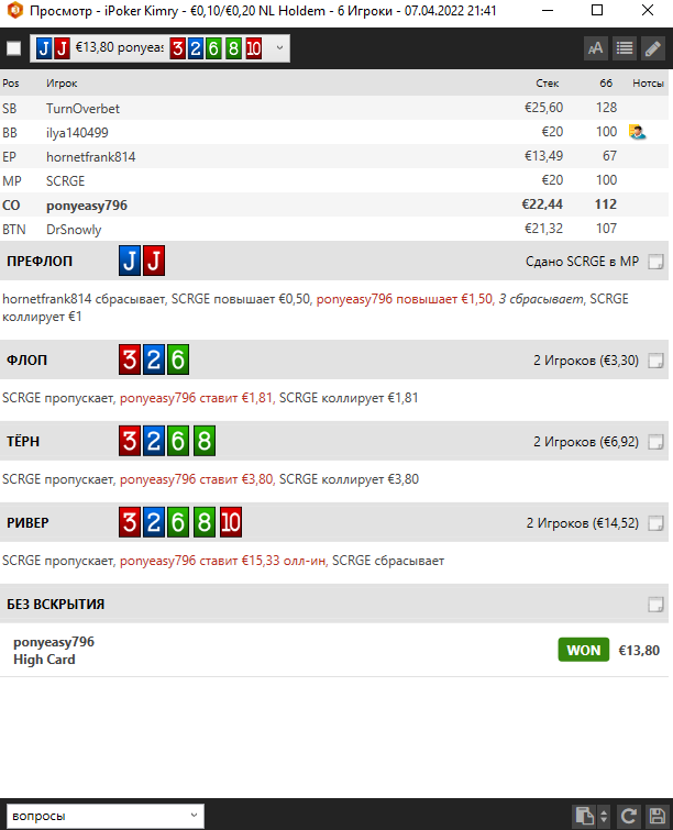 Одсы на колл тёрна окоо 26%. и мало того что мы бьём любые блефы оппонента пусть и мало их у него, так ещё и велью бьём по типу или . И пусть он конечно не всегда ставит эти руки, но точно будет ставить частично, и пусть он редко блефует как вся поляна, но фолдить при том, что одсы 26% это адовая нитокатка и игра против профита на мой взгляд. Да, это не суперплюсовый, но точно не минусовый колл будет здесь.