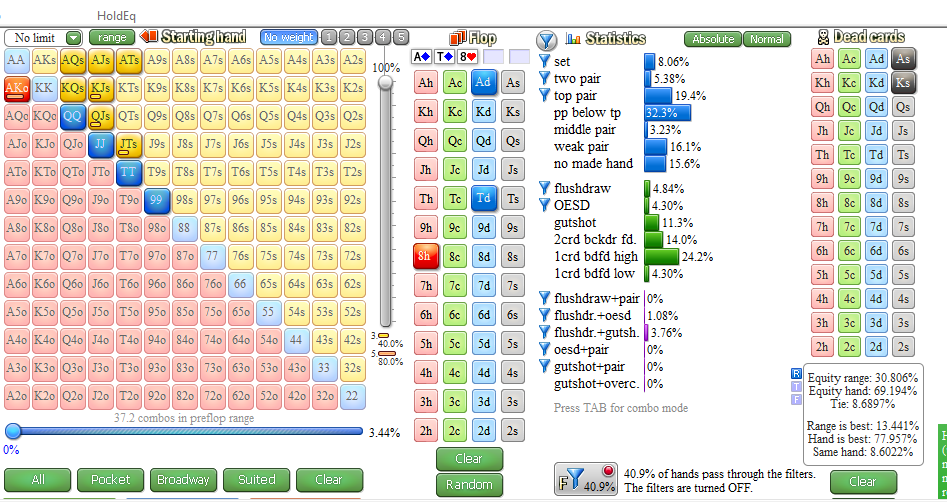 По такой структуре флопа, если я не ошибаюсь на вскидку, у тебя не будет прям крутого примущества по эквити и реализации эквити тем более, но по натсам будет все же легкий перевес. У опонента нету тузов, мало АК, все остальное поровну.