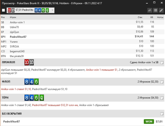 Дополнительным агрументом за колл является то, что пуш оппонента выглядит больше в духе лишь бы ты упал, а не так как-будто он хочет с тебя денег. И фиши-маньяки так же как и слабые, но агрессивные реги, практикуют часто слоуплеи в подобных ситуациях, понимая что тебе толком не с чем платить на пуш после мелкого бета, и одновременно прилично переблефовывают в таких пушах. но и без этого аргумента, наша рука достойна колла по тёрну, хоть ситуация внешне и не выглядит жизнерадостной.