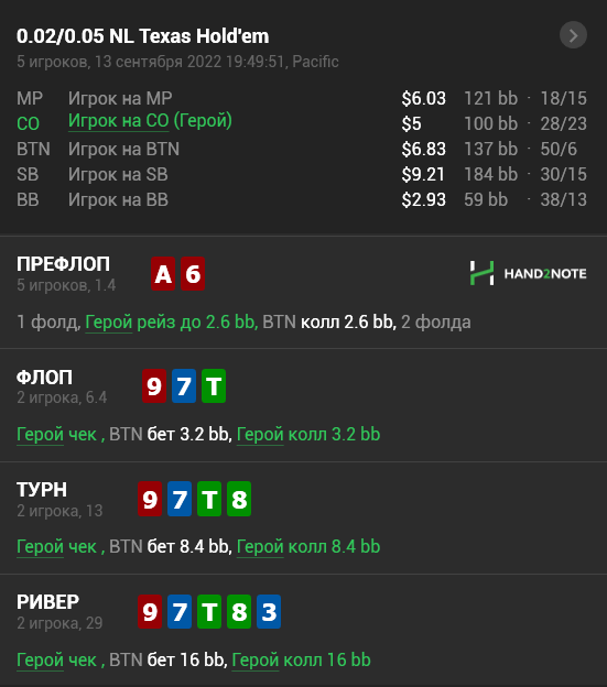 с кикером выше. Потому что это пассивный фиш и они частенько заводят колом сильные руки с префлопа. По сути нас спасает только бекдорное ФД, которое дает нам +4% к эквити. В игре ты сделал кол и он крайне граничный против пассивного, но всё еще допустимый.