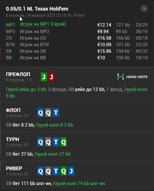 Подводя итог, наша рука по моим подсчетам во флопзилле стоит порядка 40-42%, поэтому колируем его пуш, ты хорошо сыграл.