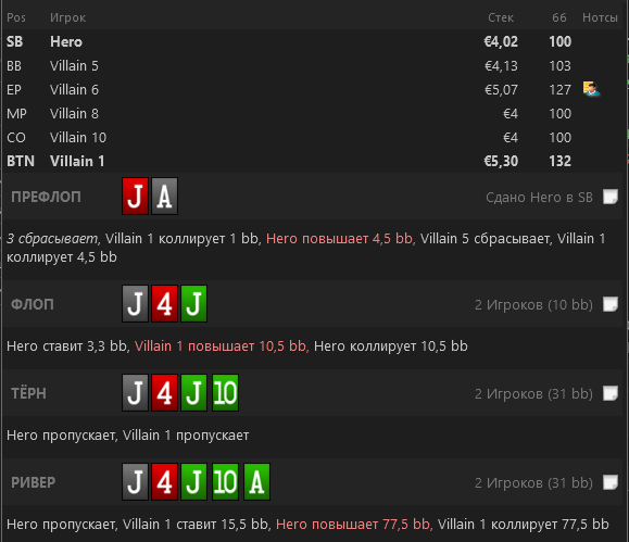 По итогу 4,5 бб мне "диап" фиша не стал особо ясен, кроме типичных красивых карт, коннекторов с хз каким зазором, картинок, пар и любых Ах. На этот сайз фиш может смело вколлить и Q2s, потому ему "удобно играть" в таком положении, ходя после Хиро. Я имею в виду наличие позиции.