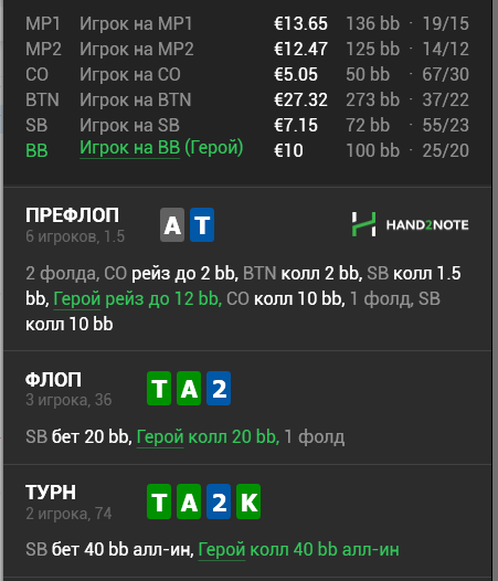 Префлоп я думаю колд колл не лучший вариант, потому как рука не особо хорошо играется в мультипотах и лучше её разыграть в ХА или вовсе забрать банк на префлопе. Задумался немного нам выбором бет сайзинга из-за игрока на СО со стеком всего в 50bb. Если давать 3 бет 15bb+, то получается не очень приятная ситуация в случае пуша, где вроде коллировать надо, но не факт что хватит ШБ и в тоже время если дать слишком мало, то он не упадет и залезет весь стол. Выбрал что то среднее, с планом фолдить на пуш.