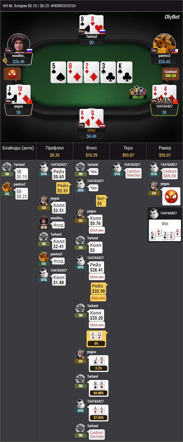 В общем я не знаю где я тут ошибся, мне кажется я сыграл если не супер то не очень плохо. ЕP - хороший фиш, СO - фиш более менее, SB - неизвестный но по колд коллу с 88 мы понимаем что это фиш...