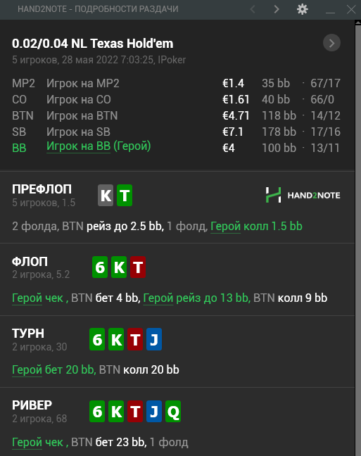 И по терну, по мимо того, что на такой карте терна у нас падает эквити КТ, бетнуть её в плюс конечно можно, побольшей части за счет эквити и ФЭ, но что тогда остается в чеке? у большинства оппонентов низких лимитов, есть лик, если они играют чек/рейз флоп и чекают терн, то фолдят 60%+ на ставку и в ставке по терну имеют недоблеф. Так что уверен, если хиро играет здесь бет по терну после чек/рейза с КТ, то он недоблефовывает и оппонент может его легко эксплойтить оверфолдами, а так же ставить в его чек на любых двух.