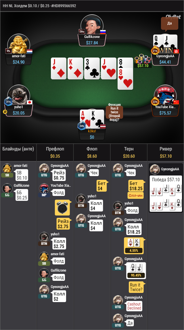 ТЁРН: Вышла неприятная карта на самом деле и оппонентов по-прежнему двое. У тебя тут нет вельюпуша как такового. Надо было ставить аккуратную половинку и падать на пуш. Пушем ты выбиваешь часть печальных довишек, а так же слабого короля. Тоесть ты чрезмерно давишь на диаппазоны оппонентов на те руки, которые тебе надо вельюбетить. Так как кроме этих рук ты не бьёшь ничего. А когда против тебя 2 оппа, то высока вероятность что 1 из них на готовой руке сидит, а второй на дро.