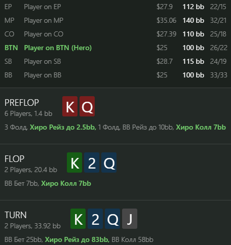 начнем с этого... Частота рейза зависит от того, как какой диапазон попал в ту или инную структуру борда и чем хуже твой диапазон попадает в доску и при этом практически не имеет натсов, а у твоего оппа наоборот, тем ниже должен быть рейз. Данная раздача как раз таковой и является: у тебя из велью рук нет ничего, кроме этого самого допера (QQ, KK, ТП ТК, AA все должны быть в 4бете в этих позах). По этой причине твой рейз тут должен быть низким в целом, но т.к. из велью есть только KQ, то эта комба рейзится примерно в 20%. В целом же для упрощения можно на таких структурах вообще обходится без рейзов.