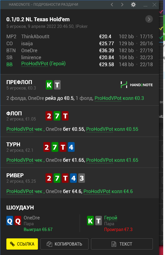 я считаю что флоп и терн сыграл хорошо, а вот по риверу хороший ли это кол? Оппонент неизвестный больше похож на рега. решил что не доехали дрова поэтому решил заколить.