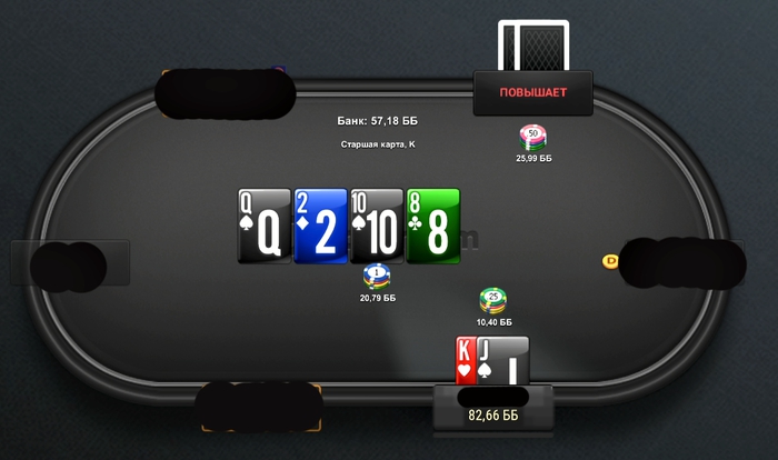 Turn 8♣. Hero bet 10.4bb. CO raises 25.99bb (в его стеке остаётся 63.51bb). Pot 57.18bb.