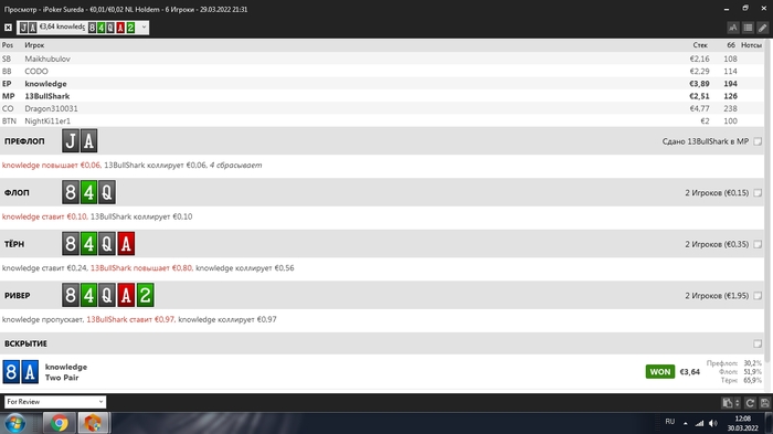 РИВЕР: ЧЕК! Ожидание чека точно будет выше. У твоего оппонента очень мало рук слабее, что заплатят тебе ривер на такой экшен, а вот руки сильнее по типу сета или допера там имеются, раз мы предполагали что это фишман. Твой бет по риверу будет уже 4 баррелем, так как был бет по флопу и бет и рейз по тёрну. Поэтому твоя ТПХК плоха тут для вельюбета даже против фишмана. Была бы информация что это дикий телефон, то без проблем, но пока её нет, просто чекаем, так как дрова не платят естественно, а вот