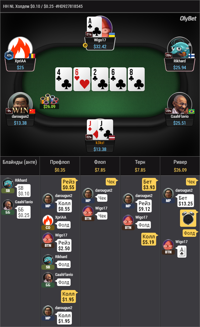 РИВЕР: Хороший чек и фолд! Одсы окло 25%. На велью готовую руу слабее он не поставит, в блеф готовую руку слабее не превратит, и блефовать ему тут не с чем. Таким образом мы не бьём ничего из диапазона бета оппонента.