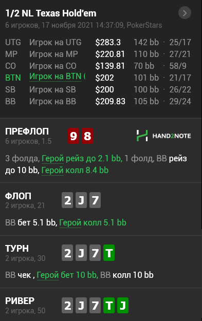 Infinities4, я в курсе. Но на данном этапе лучше чем нечего... тем более что я обычно его использую чтоб узнать общий настрой, например как и в этой раздаче что SB по большей степени должен играть от чека монотонный флоп, а там уже разводить на чек-рейз крупный и чек-кол.