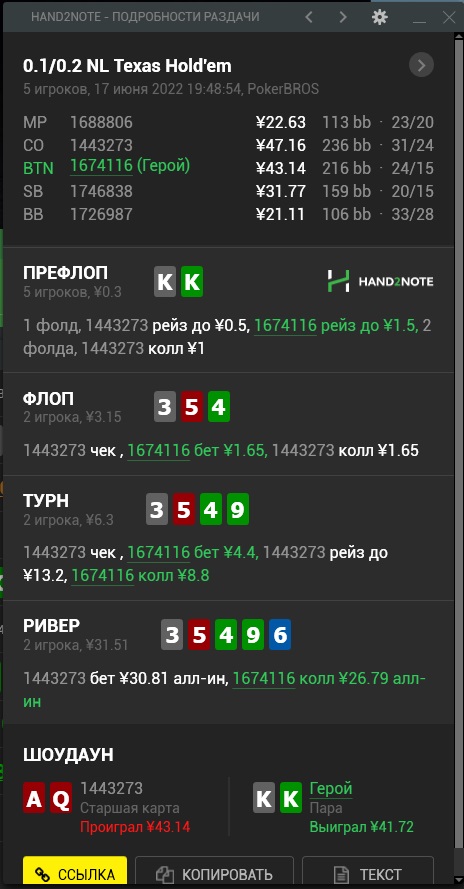 Ривер: а вот тут далеко не все так однозначно и есть нюансы. Если брать только ту информацию, что это агрессивный рег, то это фолд, т.к. даже у агрессивных регов по такой линии блефов недостаточно для колла, а если же ты действительно видел и знаешь, что опп любит поисполнять, как, например, в этой раздаче, то тогда конечно - энста колл. Причем ты это должен увидеть своими глазами, а не так