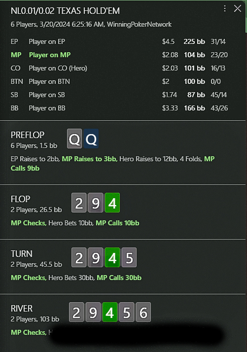 Но, это только в теории. На практике, мы так редко получим блеф рейзы, что можем гораздо чаще ставить свое уязвимое велью, которое ставить не должны (например, QQ без пики). И баланс сайзингов, мы тоже в большинстве полей соблюдать не должны, так как каждый играет в свои карты. Поэтому, линия Хиро и сайзинги имеют место быть и терн в таком случае последняя улица велью и даже по бланкам нам нужно играть часто чек вслед на ривере. И на таком ривере, у нас чек.
