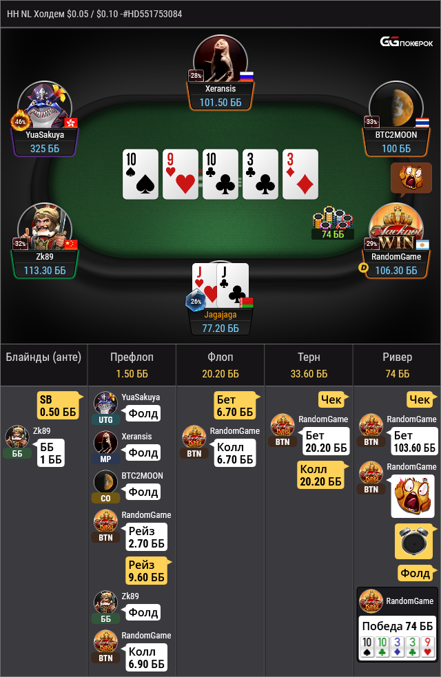 Ривер: Мы приплыли в ситуацию, куда поставили себя сами. Благо ривер полнейший бланк. Нам сейчас не важно стали фуллами его трипсы или нет они и так и так нас бьют. Ни ФД, ни СД, ни ГШ не закрылись. Своей рукой мы блочим комбы JT, но в то же время и блефы QJ, и трефы. Несмотря на всё это у оппонента здесь куча вариантов для блефа. Колл для нас в районе потбета. Нам надо выигрывать 1 раз из 3. И выигрывать мы будем чуть ли не в половине случаев. Фолд ривера - преступление против агрессивного или обычного рега. За колл так же говорит и то, что в наш чек на тёрне он не всегда поставит фуллы, каре и часть трипсов. Так как он в позе и банк разогнан. С такими руками ему периодически стоит подождать пока ты сыграешь бет чек бет, и в эту линию он спокойно может пушить ривер. Против пассивного же оппонента если мы чекаем тёрн, то это фолд или максимум колл и фолд ривера.