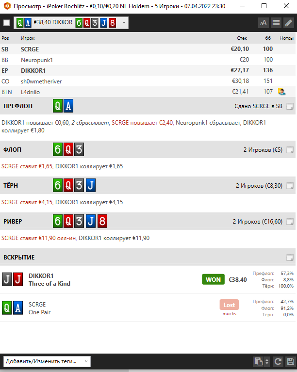 - если у оппа все AQ в наличии с ПФ, то легкий вельюбет на терне и мердж пуш на ривере также имеет место быть, но и чек/колл против умеющего блефовать оппа также возможен;