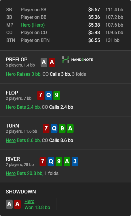 ПРЕЛФОП: Хороший опен! Нас заколол оппонент, который склонен к достаточно высоким фолдам по всем улицам, а так же дико пассивен.