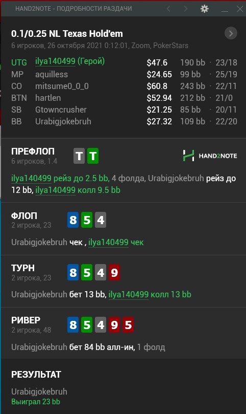 Ривер: С учётом достаточно мелкого сайза по тёрну, он не очень похож на сильную руку, и странного 2х овербетпуша всерьёз бы рассматривал вариант с колом опираясь на его агрессию. Но если инфы мало, то и зафолдить ошибкой не будет. Однако линия оппонента выглядит так, что он просто нас выбивает из банка, а не хочет получить оплату от нас.