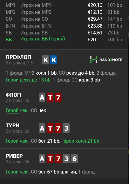 ТЁРН: Хороший чек и колл! Есть смысл уйти в блефкетч против подобного оппонента по тёрну.
