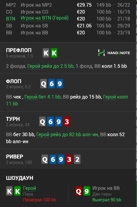 Даже несмотря на то, что это нл20, а не нл2, я бы продолжал придерживаться правила, что с флопа на стек желательно играть с чем-то из серии топовые доперы+ (а то и сеты+). У хиро здесь оверпара. Поэтому колл флопа - однозначно, но уже бы на ре-рейз поднапрягся. А вот на последовавшую очень плотную ставку тёрна плотно бы задумался о фолде уже на тёрне. Если верить регулярам этих и более высоких лимитов, такой агрессии в блеф здесь всё ещё достаточно мало. Плюс - да, оппоненту на этой выборке рук, явно хорошо заходит, но всё-таки w%SD крайне высокий. Я бы его трактовал, как то, что оппонент так часто доходит до ШД и так часто выигрывает там, что от него не стоит ожидать блефов, скорее, он старается ставить с хорошей рукой столько, чтобы ставку заколлировали (иными словами, не жадничает и "по-свински" не добирает обычно). Против такого даже коллировать его ставку по тёрну, чтобы сдаться на очень вероятную ставку ривера, думаю, не лучшая идея.