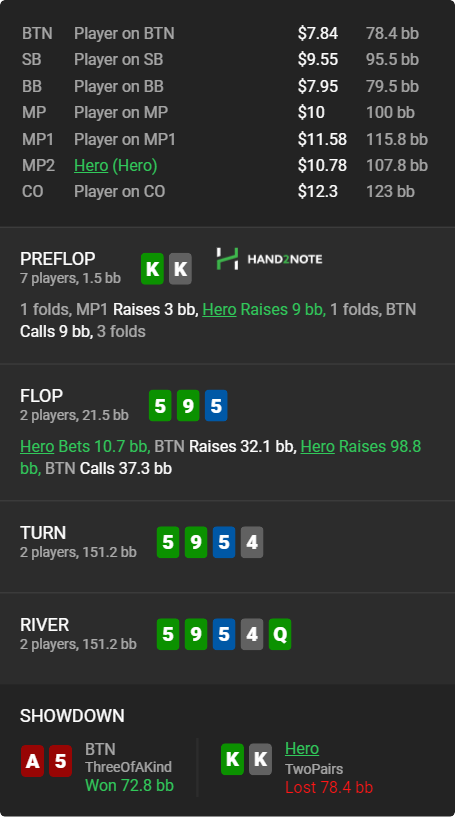 Луз-пассивный фиш коллит в холодную 3-бет в позиции Бтн. Постфлоп статы слишком пассивные. Как следовало играть на флопе? Закладывать ему в рендж одни натсы, и тогда фолд, или добавить руки ТТ-QQ и сильные комбо-дро, и тогда пуш?