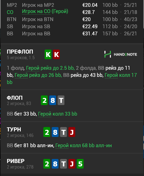 тут есть желание и на префлопе катится даже на 140 бб, всетаки динамичные позы у нас--стил-рестил... очень часто там будут АА, но и не раз от регов видел мин 5 беты с АК, типа лучшие блокеры и бла бла и отскока нет уже в таком случае, а так они более пикантно продавливают ДД и ВВ и теже АК время от времени.....