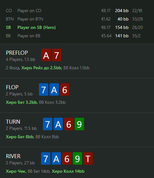 Соперник фиш, 35/2 40 рук. Флоп радостный велью бет, скорее всего стоило рассмотреть бет пот или даже овербет. Терн уже менее радостный бет и ривер совсем пошёл не туда, что нам выбрать?