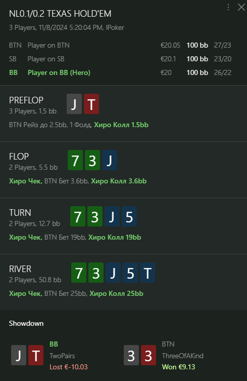 РИВЕР: Только фолд. Это просто сбор денег с рукой средней силы. Если бы оппонент ставил адекватно тёрн полярным диапазоном, то практически никогда на таком ривере не появился бы мелкий сайзинг. Зачастую так ставят руки, которые не стоят дорого, но с которыми им жалко прочекать. На нл20 эта линия сильно перекошена в средней силы руки. В данном случае это приличные допера+. Их будет мало. Блефов же там практически не будет. Такие коллы можно делать исключительно по нотсам.