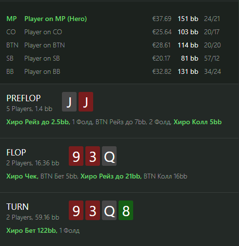 ТЁРН: Нужно было играть чеком. Пушем рук сильнее мы практически не выбиваем. Да и дро нам не выбить в большинстве случаев, так как практически все ФД оппонента имеют дополнительное эквити в виде пары, или гатшота. По итогу такой пуш - жёсткий залив денег оппоненту. Фолдэквити будет в районе 25%, а по эквити наша рука поедет в ад, имея в районе 15-20% против диапазона приёма оппонента.