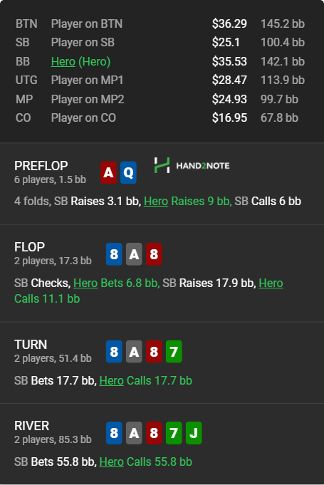 Никакого чека на флопе даже близко нет и это всегда ставка за мелкую. Придумать тут блеф крайне сложно на xR, но у тебя достаточно сильная рука для фолда. На терне на 1/3 опять таки фолда нет, а вот на ривере нужно падать, т.к. по такой линии всегда будет недоблеф, а в зуме так подавно, на велью же ни с чем хуже так не играют.