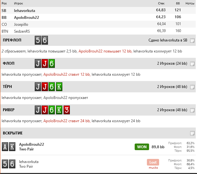 Бет-чек-бет в 3 бет потах оверблефовый на одном типе досок и андерблефовый на другом! Так же конечно будут влиять позиционные конфигурации и сайзинги, так что просто сказать бет-чек-бет в 3 бет поте андерблефовый, точно нельзя и это плохой совет.
