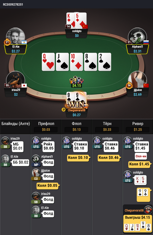 Как уже хорошо написал Navy463 выше, по хорошему, на ставку флопа в 3/4 с 3 аутами на усиление вполне логичен фолд. Но если вдруг хиро решил заколлировать флоп, то тёрн и ривер я бы играл также, как хиро: море сильных комбинаций (готовых с флопа) + блефы рука хиро бьёт, а проигрывает только АК. Да и то как-то не сильно похоже, что с АК он бы так плотно ставил флоп и овербетом лупил по тёрну. Хотя, и в такой линии некий смысл найти можно: доска на флопе очень скоординированная - в неё много рук могли попасть, потому оппонент начинает сразу разгонять банк, на тёрне поехало ФД, и он с АК без пиковых решает ещё агрессивней защищаться. Ну а ривер...надеется, что всё-таки у хиро нет пикового флэша. Да не, как по мне, всё-таки как-то странно бы выглядела подобная линия ставок с АК.