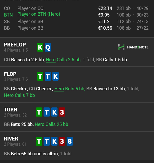 Я подумал может на терне сразу фолдить, много ли денег я здесь заработаю против малоизвестного оппа? Я прикидывал примерный диапазон , ничего хорошего у меня не получилось с KQ