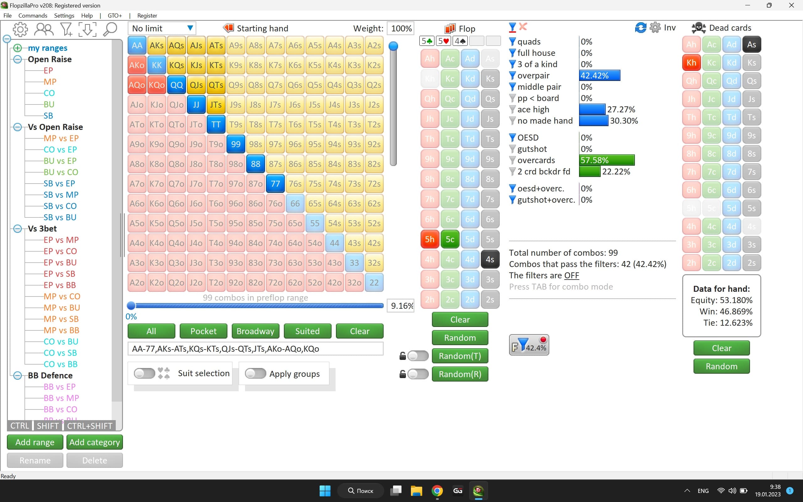 ZXC_Deadinside3, На вопрос о том, есть ли у нас к-бет флопа нужно посмотреть наше эквити против диапазона оппонента. Если оно больше 50, значит контбет есть.