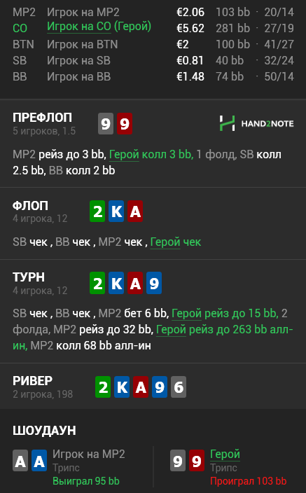 На терне играем рейз и на 3 бет выкидываем свой сет, кроме слоуплея другого сета ничего не увидим. Какие АК играют чек на флопе? или 22 или А2? Думаете он на терне сыграет бет/3 бет с ФД? в поте на 4 игрока? А9s? сколько их там с учетом наших 99, одна комба А9сс и то если он станет хоть когда ни будь с ней играть 3 бет на терне.