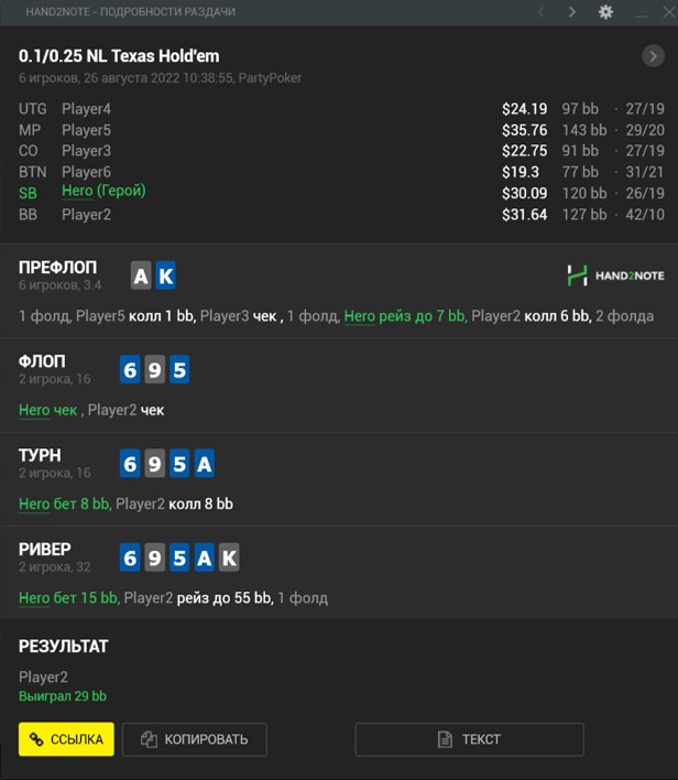 2) если опп все же рег, то в обычном споте действительно этот борд лучше подойдет именно ему, но после такого конского изорейза (сайзинг, кстати, не нравится и от него будет эффект такой же, как и от 5-5,5) рег не должен заводить сюда кучу средних рук, которые будут у него в обычном споте и которые не дадут нужного ФЭ, в данном же споте за счет их отсутствия ФЭ у тебя будет предостаточно и можно спокойно играть от ставки.