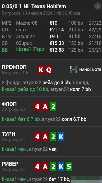 По риверу, в такой линии только под страхом растрела выкинул бы. Всякой ерунды тут дофига, да даже есть сплиты иногда. Т.е. KQ. Иногда даже Кх слабже поставит. Эквити тебе надо с гулькин фиг. Часть ТП уже капнулись по терну. Крч изи колл, можно ещё по ШД нотс написать, и едем дальше.
