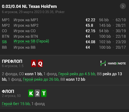 Префлоп: изолейчу с AQS и получаю 3-бет, Вот здесь вопрос, я знаю, что у BB широкий диапозон 3-бета и мы можем завести AQS коллом, но мы не будем понимать против чего играем. Условно 4-бетом я хотел получше понять, что у него за диапозон, т.е. разделить его на части: первая с ней он запушит, это натсы, 2 он заколлит 4-бет, этот диапозон вполне понятен, и будут руки, которые он выкинет на 4-бет.