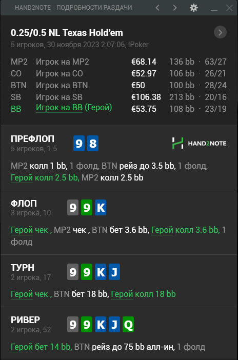 Префлоп: колл под вопросом. Немного дорого, так и рука вся под доминацией. Я бы лично такое не колил.