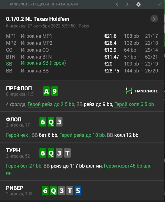 Внимательно смотрим на оппонента и его действия и принимаем решение исходя из выходящих карт тёрна и ривера. По тёрну наша рука будет и чекпушиться и чекколлиться в зависимости от этих факторов. После такого тёрна по многим риверам нам не стоит иметь диапазон донка, но опять-таки если оппонент пассивный и телефонистый, то можем. Надо подробно смотреть с кем играем.