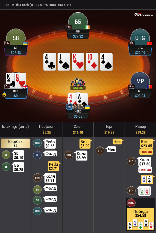 Быстрый покер. Опп - пассивный фиш. Эффективные стеки у обоих примерно по 100бб. + в этой конкретной раздаче рум "досыпал" по моему 20бб. Вопрос: Не переиграл ли я здесь эту руку ? Может не стоило пихать алл ин в фиша, а сыграть допустим бет пол пота на терне и бет 2/3 пота на ривере? Но я посчитал что уперется в топ его диапазона (10 10, JJ, KK, AQ) будет маловероятно и запушил алл ин. Против рега наверное не стоило так делать? Да?
