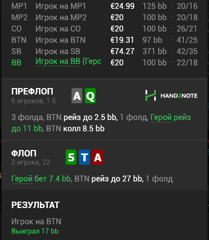 Противник 41/25, общий фолд на 3 бет 45. WWSF 43, WTSD 28, W$SD 45, агрессия по улиицам 32, 34, 39.