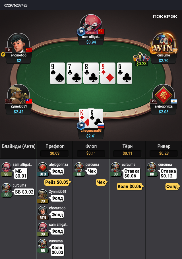 По моему мнению, нормально сыграно и логично: с рук слабее тут крайне редко что-то существенное выиграть получится, поэтому разгонять банк нет никакого смысла. Доска слишком уж дровяная и скоординированная, да ещё и подошедшая диапазону колла оппонента явно лучше, чем диапазону хиро. Поэтому задёшево стараемся доползти до ШД. По ходу раздачи 1 раз коллировать вменяемую ставку всё-таки надо: какой-никакой блокер на крестовое ФД то есть, да и КК зарывать на первую же атаку - слишком уж пассивно. Хотя, и в этом есть определённый смысл: слишком уж много карт ривера ещё больше ухудшат ситуацию. В общем, можно и так,и так - дело вкуса. Да, колл на тёрне защищает от попытки украсть банк в ответ на проявление слабости хиро на флопе и тёрне, но после этого остаётся только надежда, что ривер будет сыграно чек-чек. Но у оппонента, видимо, всё-таки есть что с таким ШДВ, что он всё-таки надеется добрать хоть сколько-то хоть с чего-то.